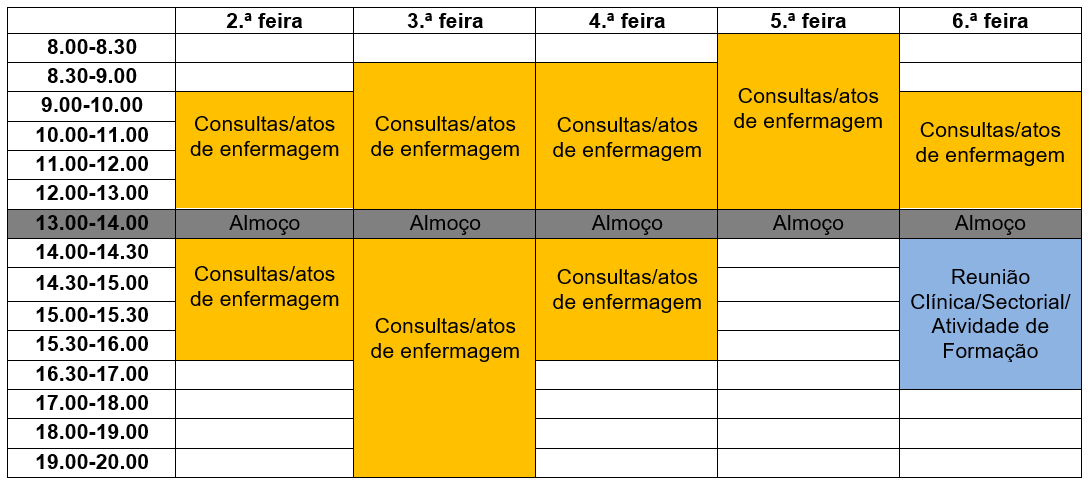 - Marcação de outras Consultas presenciais/atos de enfermagem: Neste espaço da agenda de enfermagem, inclui-se a marcação de outro tipo de atendimentos e consultas pelo próprio, equipa de enfermagem ou secretariado, podendo ter duração entre 15 a 30 minutos, conforme situação.