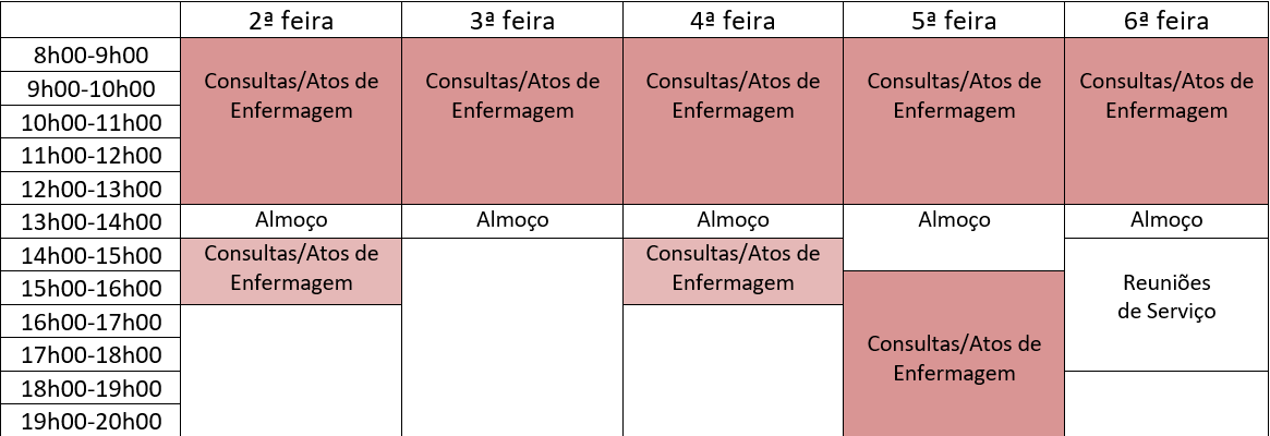 - Marcação de outras Consultas presenciais/atos de enfermagem: Neste espaço da agenda de enfermagem, inclui-se a marcação de outro tipo de atendimentos e consultas pelo próprio, equipa de enfermagem ou secretariado, podendo ter duração entre 15 a 30 minutos, conforme situação.